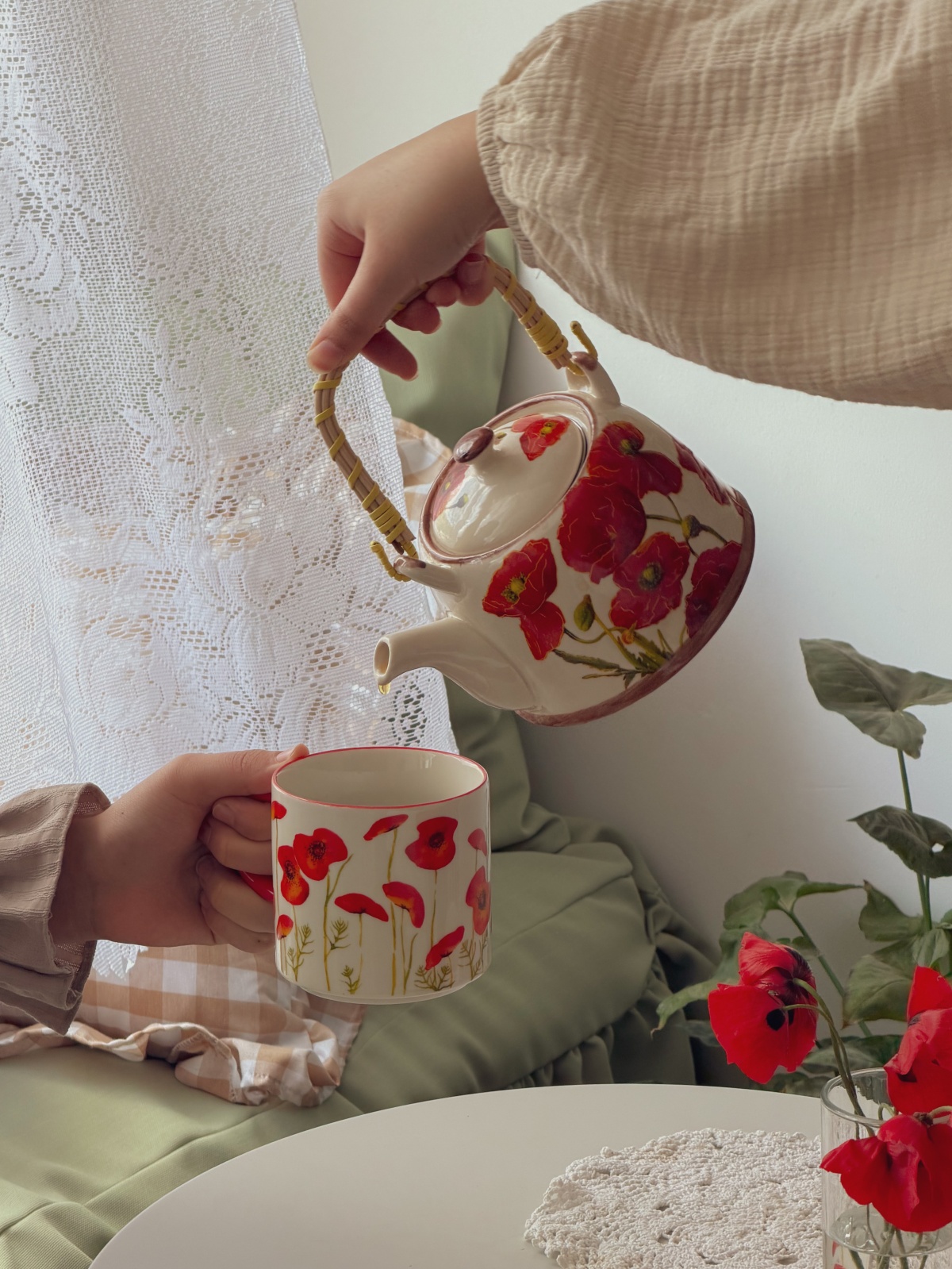 كوب بتصميم وردة مع صحنه لون أحمر ثيم ربيعي