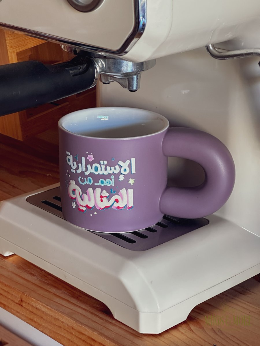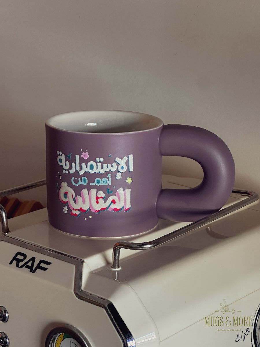كوب شفاف مع غطى وشلمونة بعبارة "الاستمرارية أهم من المثالية"