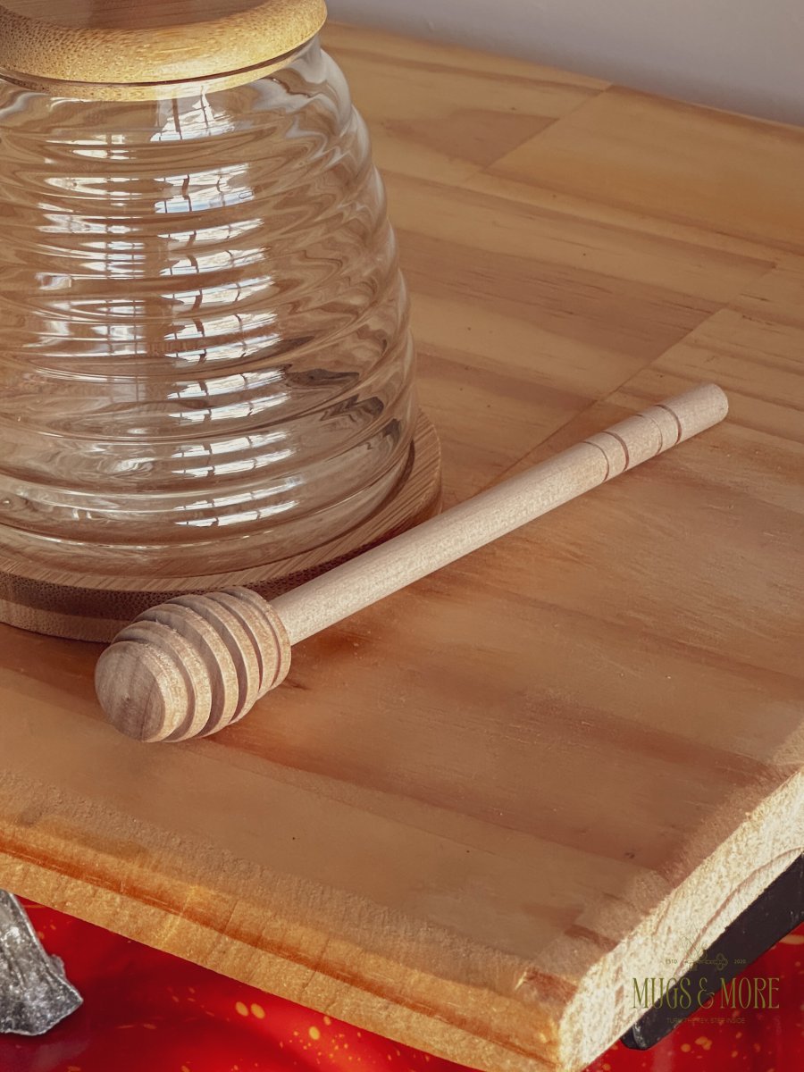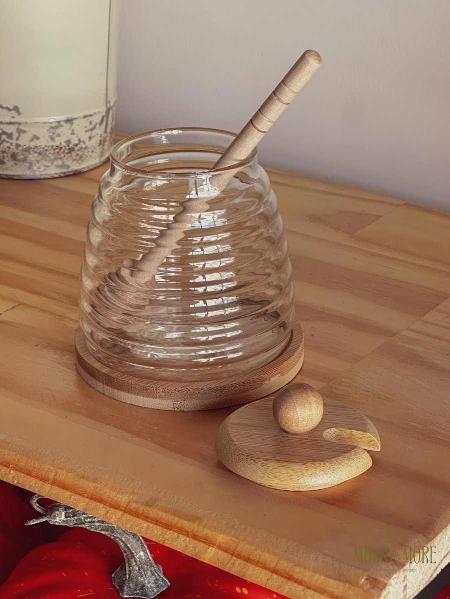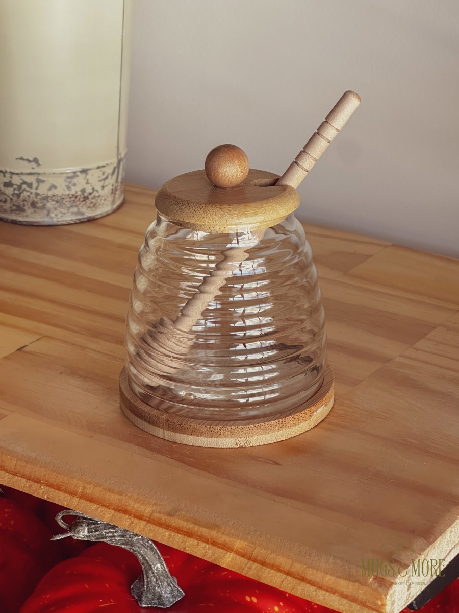 علبة عسل زجاجية مع قاعدة وغطى وملعقة عسل