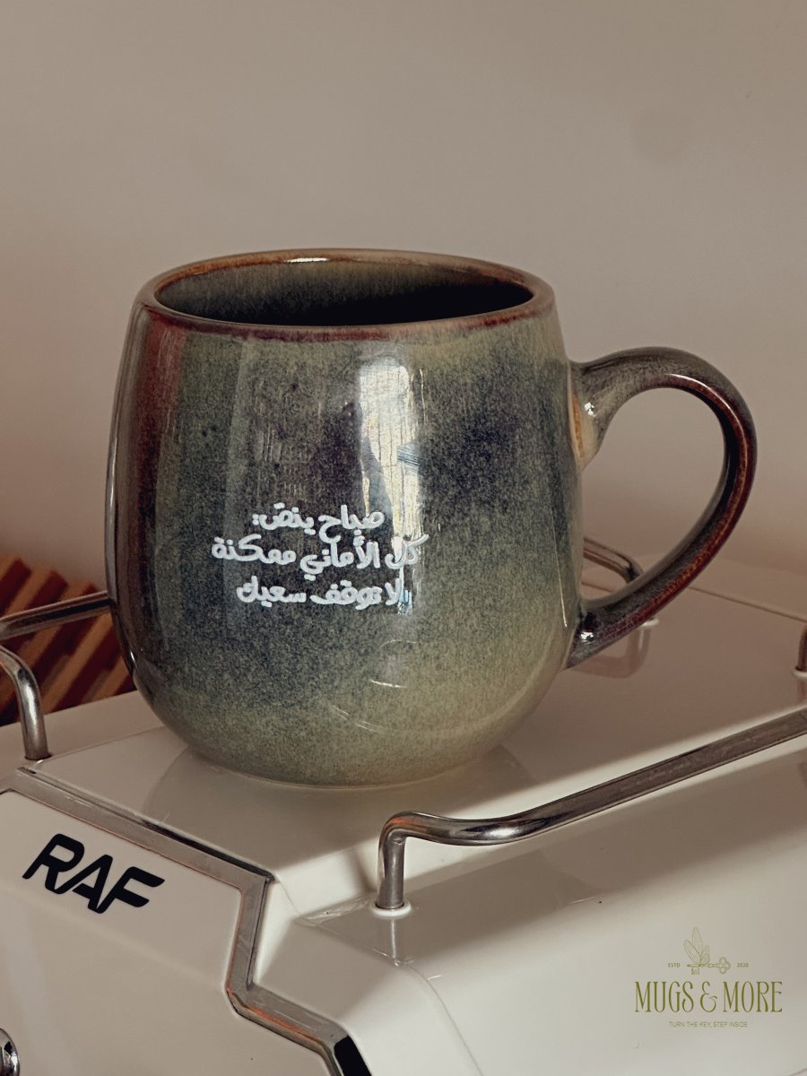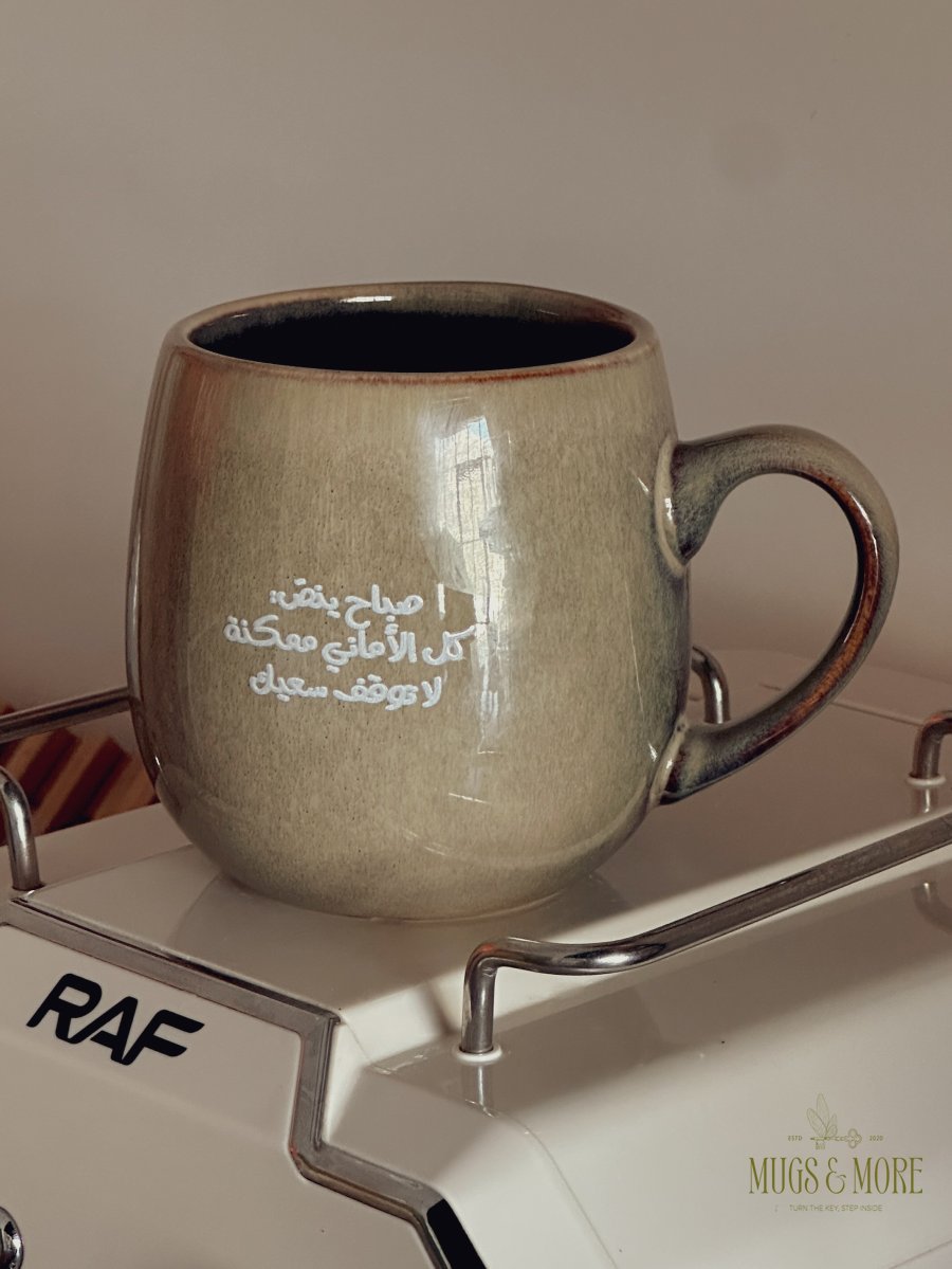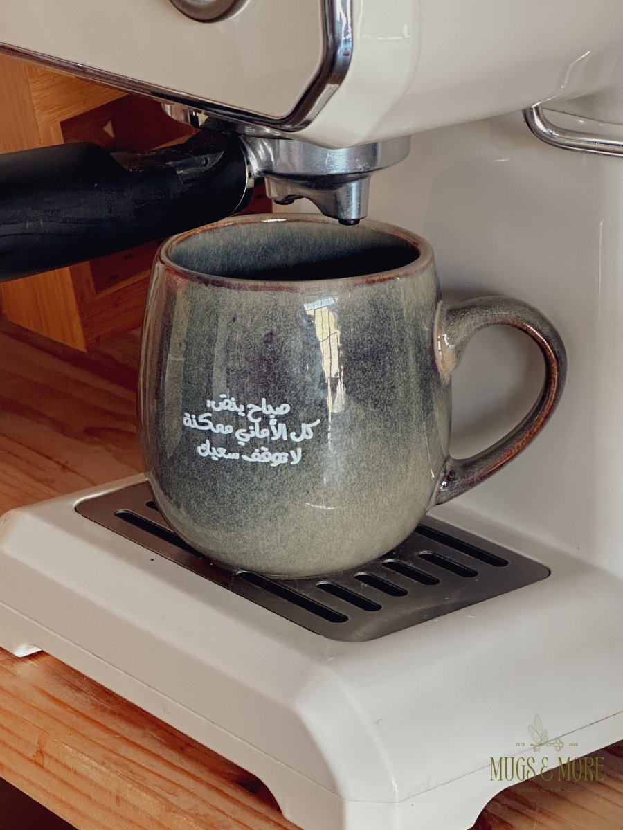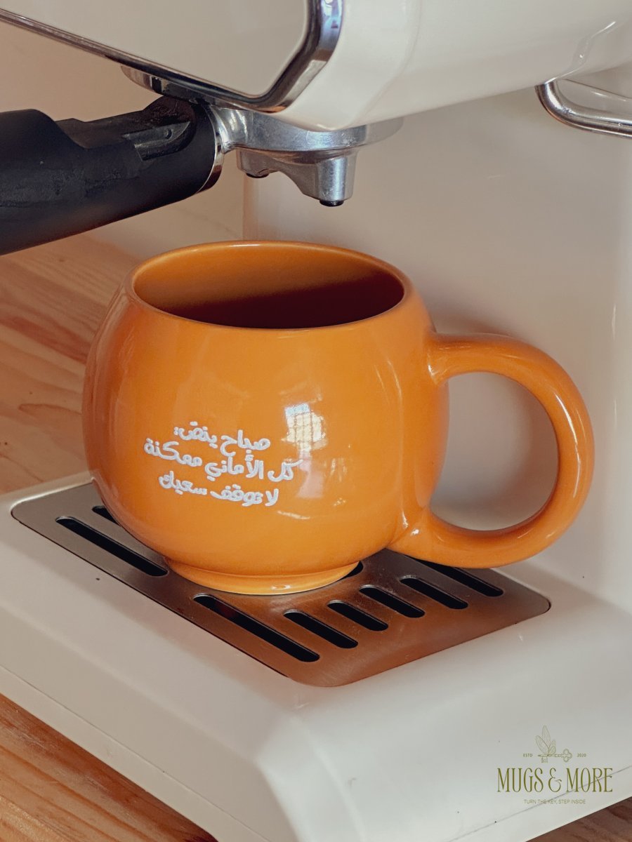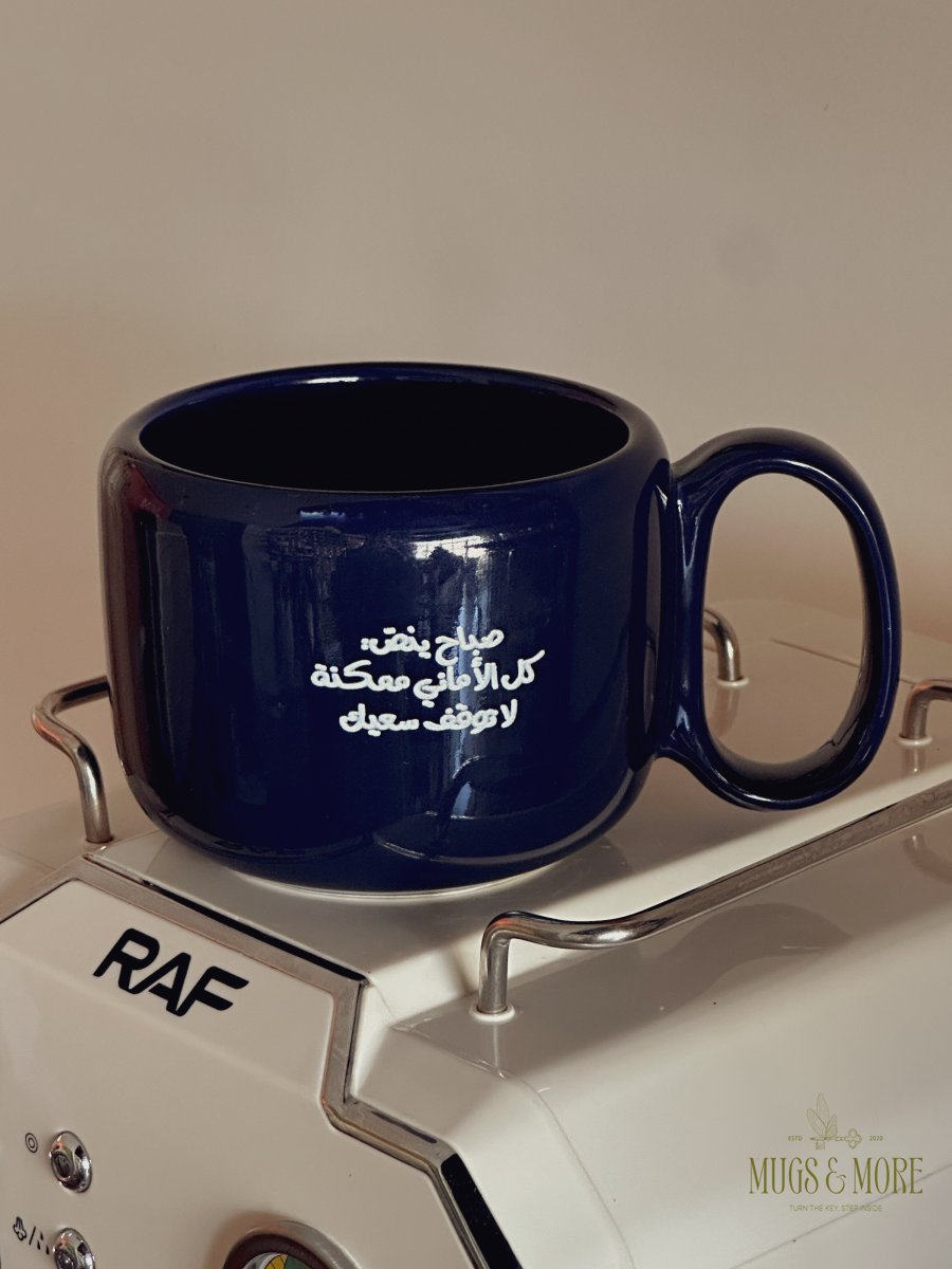 كوب بعبارة "صباح ينص: كل الأماني ممكنة، لا توقف سعيك"