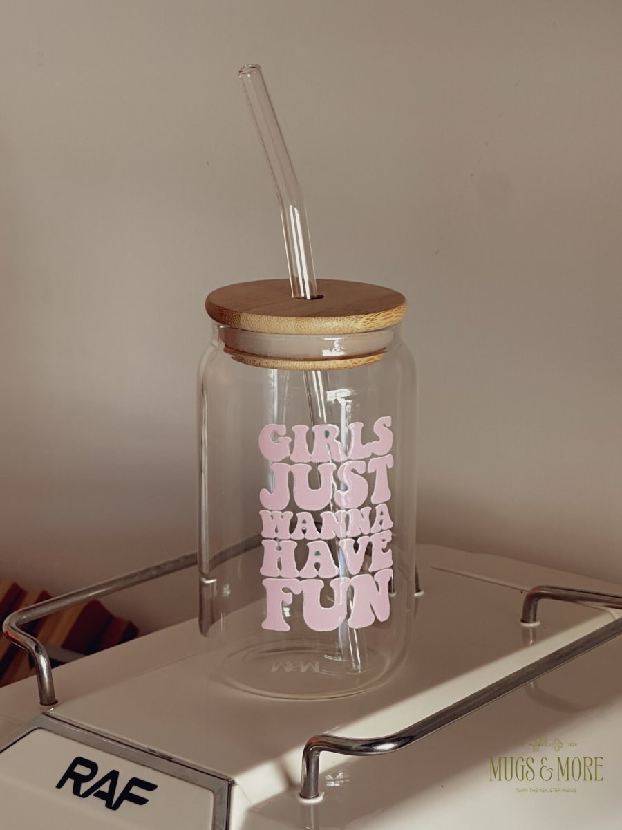 جرة شفافة بغطى خشب وشلمونة "girl just wanna have fun"