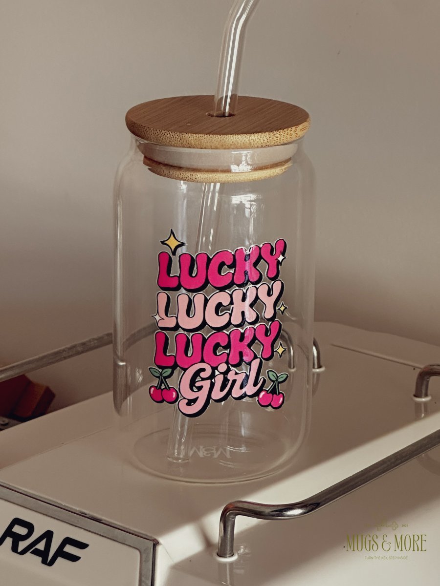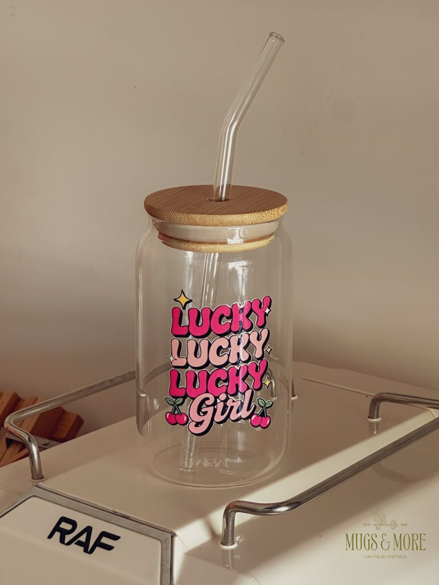جرة شفافة بغطى خشب وشلمونة "luky girl”