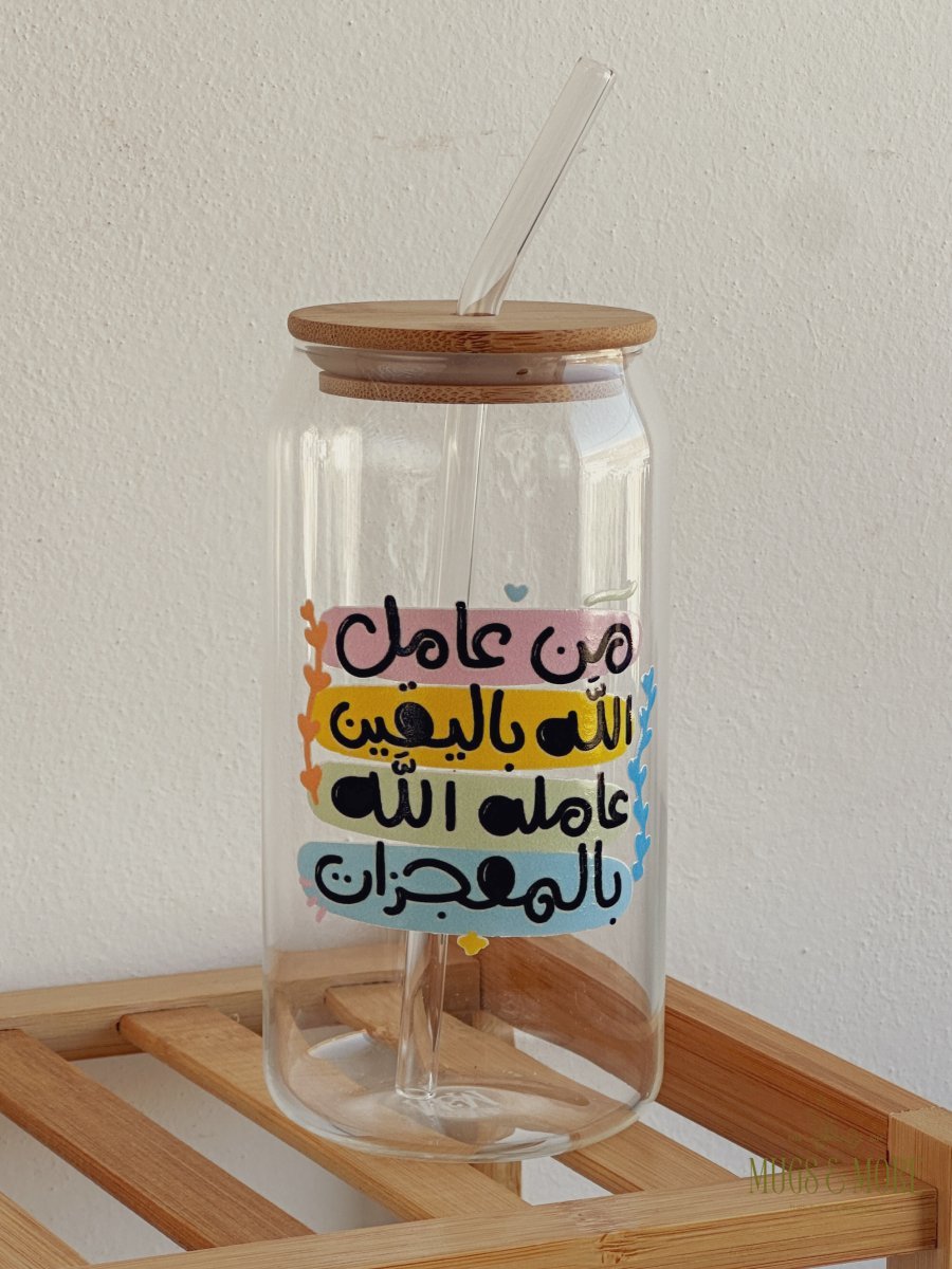 جرة شفافة بغطى خشب وشلمونة600مل "من عامل الله باليقين عامله الله بالمعجزات"