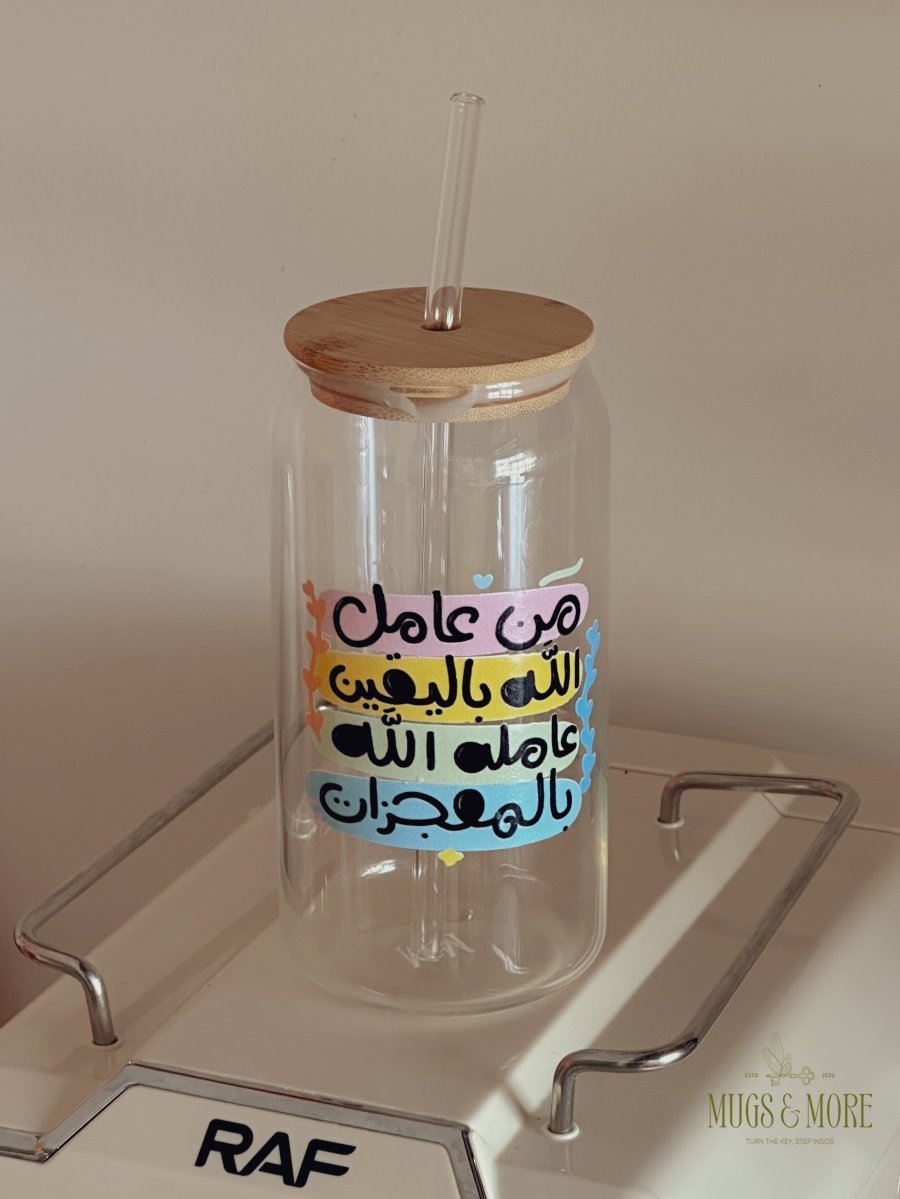 جرة شفافة بغطى خشب وشلمونة "من عامل الله باليقين عامله الله بالمعجزات"