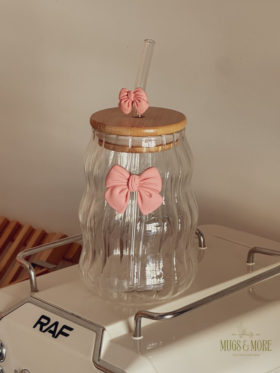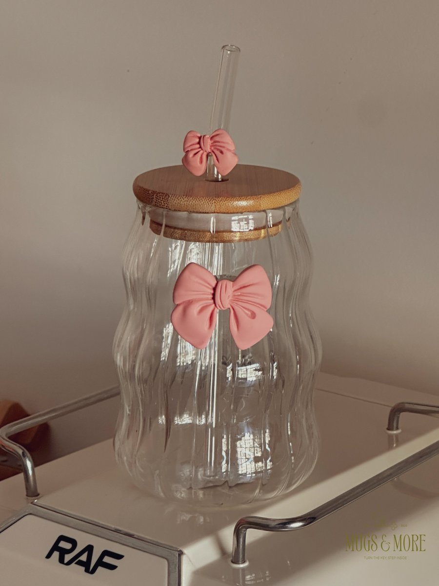 جرة شفافة مموجة بفيونكة مع غطاء وشلمونة