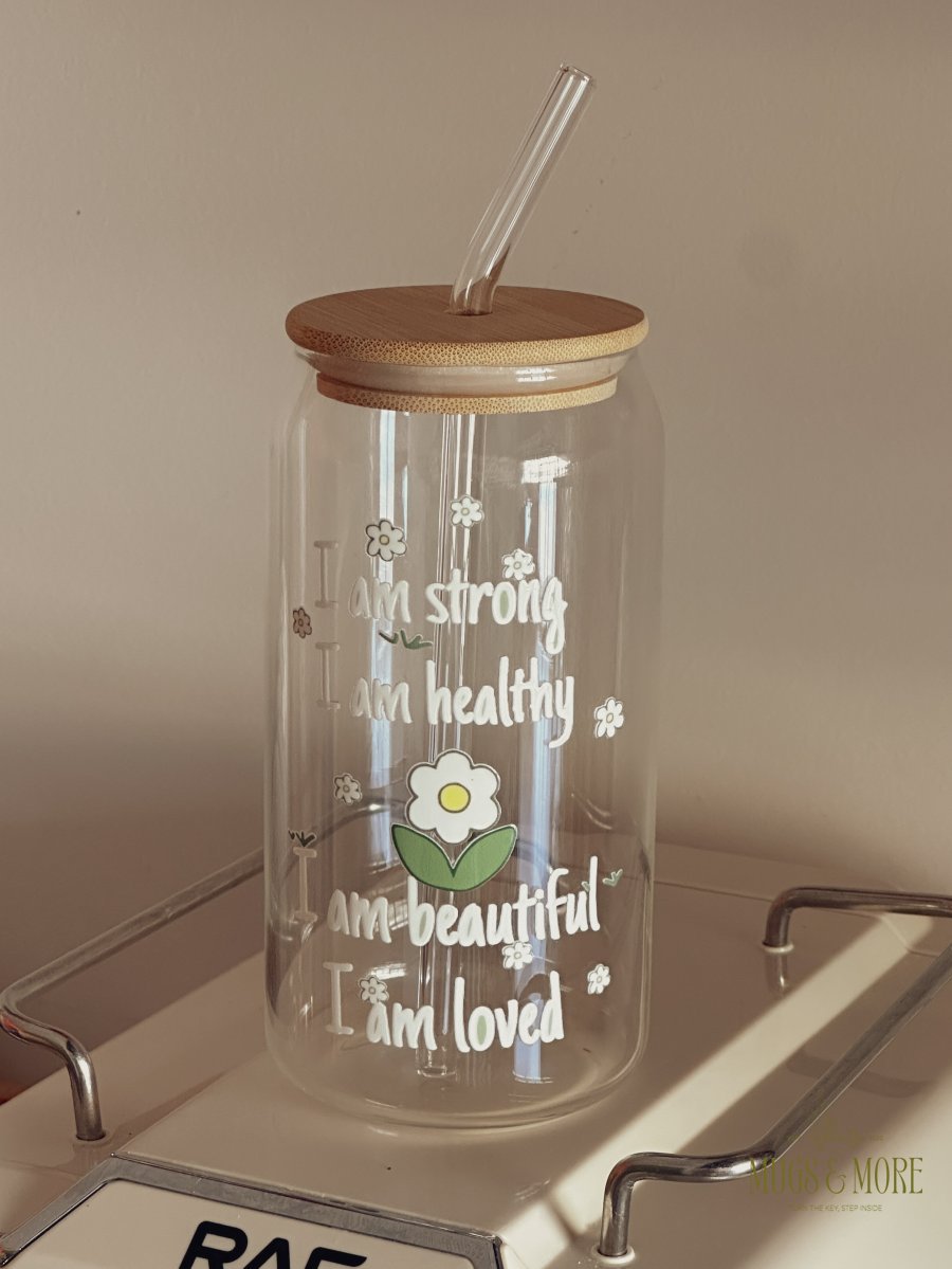 جرة شفافة بغطى خشب وشلمونة "i am strong, i am healthy "