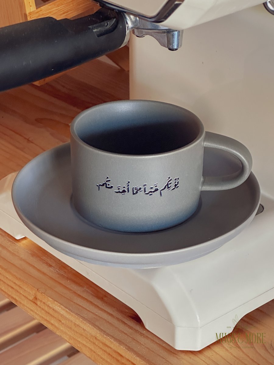 فنجان وصحنه بعبارة "يؤتكم خيرًا مما أخذ منكم"