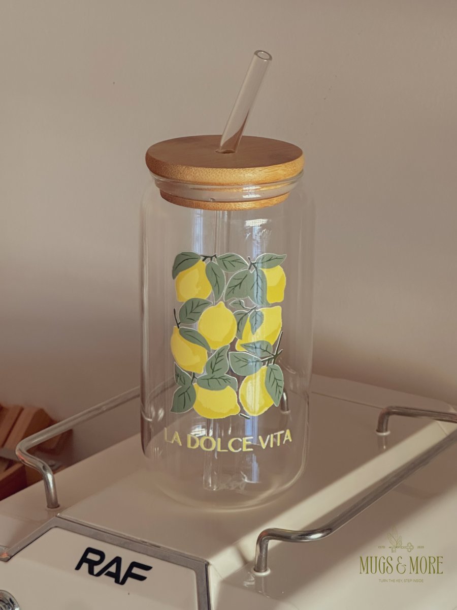 جرة شفاف مع غطى خشب وشلمونة برسمة ليمون "ثيم ايطالي"