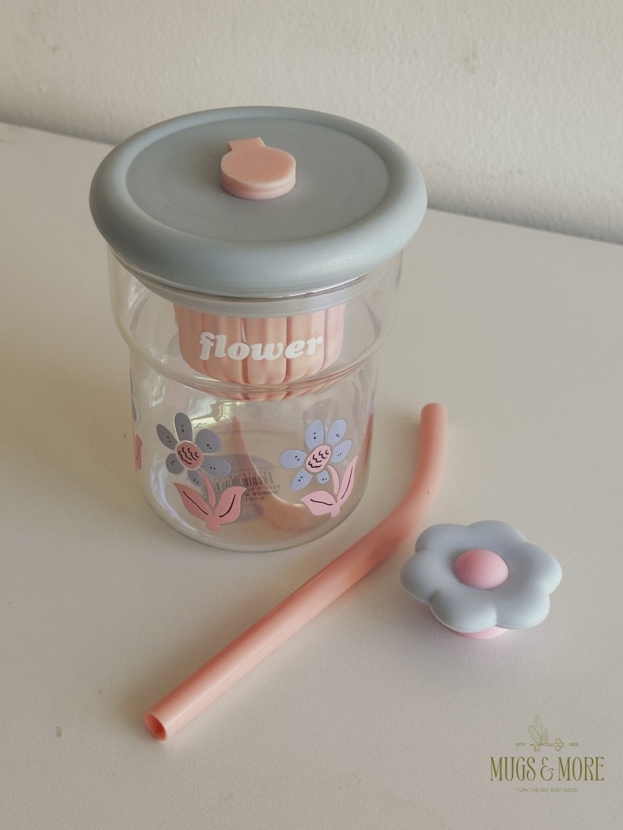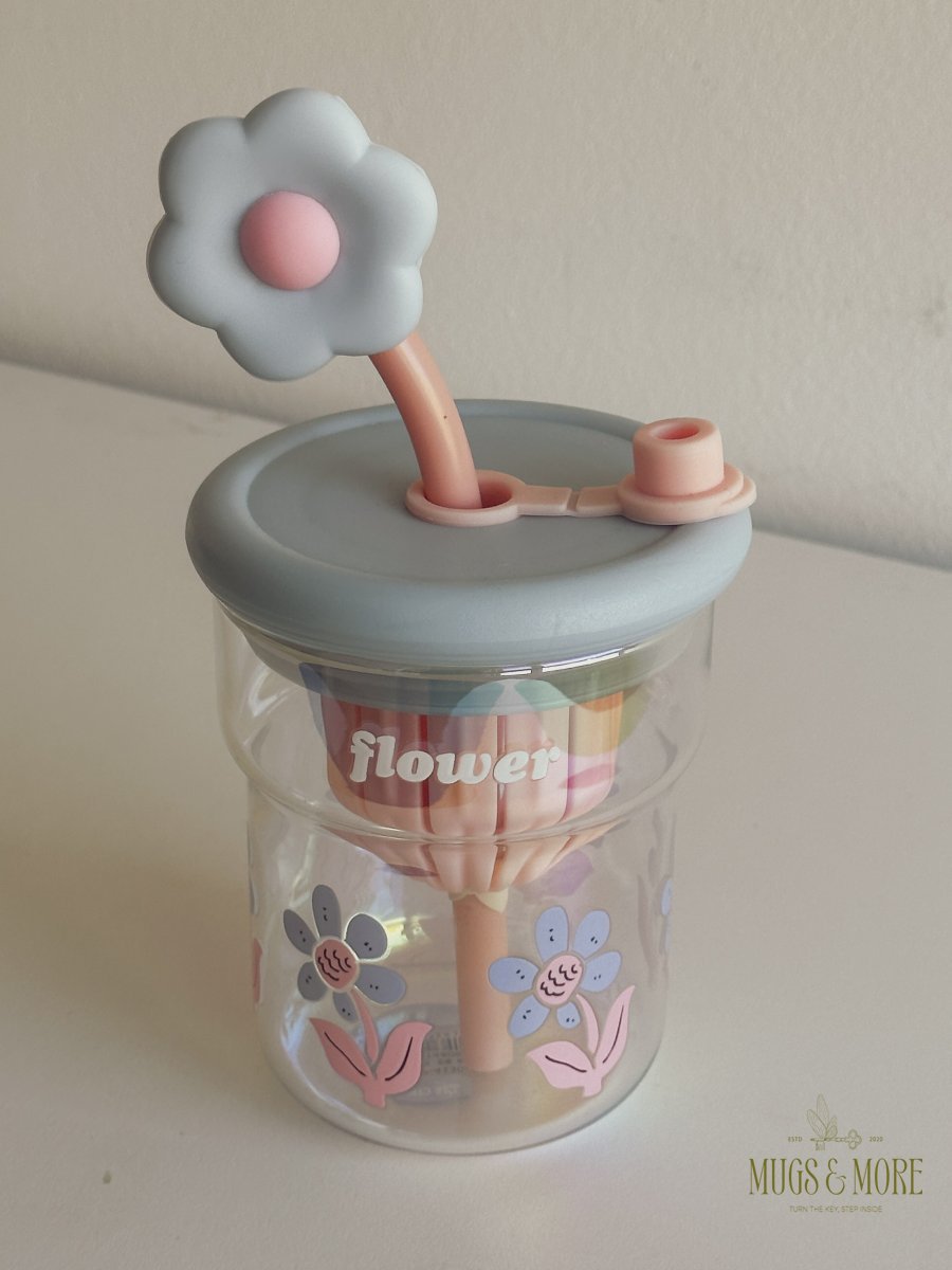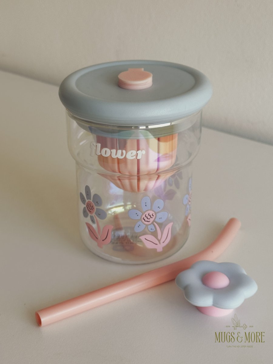مطرة زجاج برسمات جميلة مع غطى سيلكون وشلمونة وعصارة حجم 500مل
