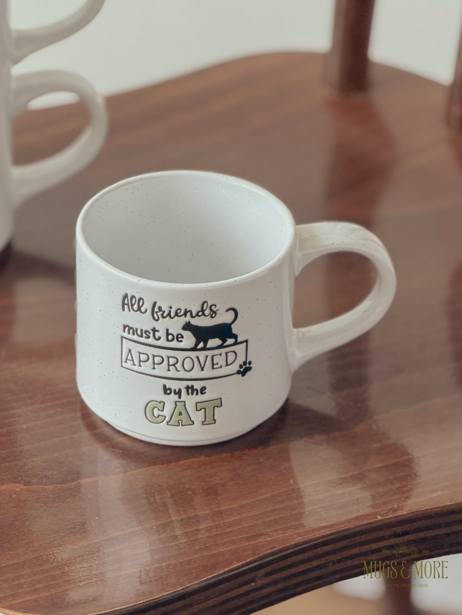 كوب قطة بعبارة ”all friends must be approved by the cat”