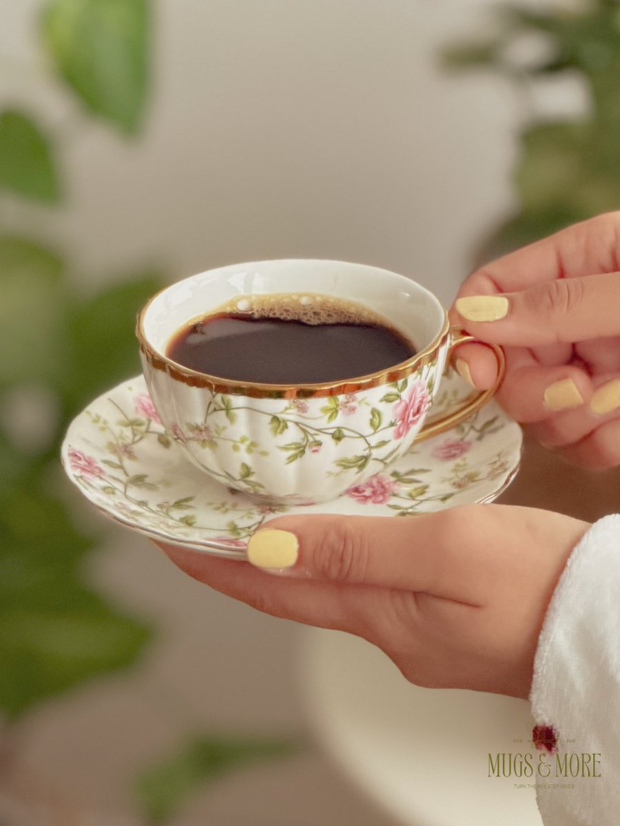 فنجان كلاسيك مورد مع صحنه بلمعة ذهبية