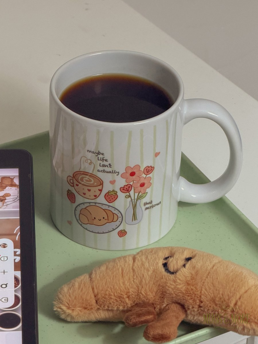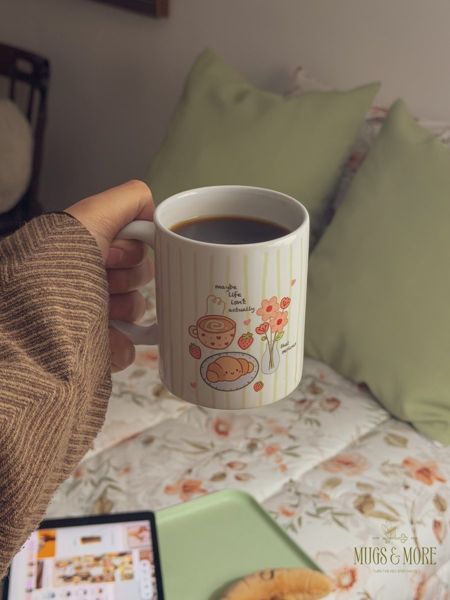 كوب جديد بعبارة "maybe life isn’t that serious🥐”