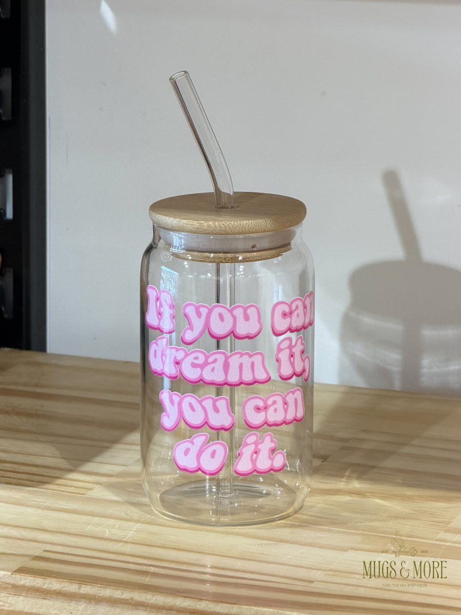 جرة شفافة بغطى وشلمونة بعبارة if you can dream it you can do it حجم 350m