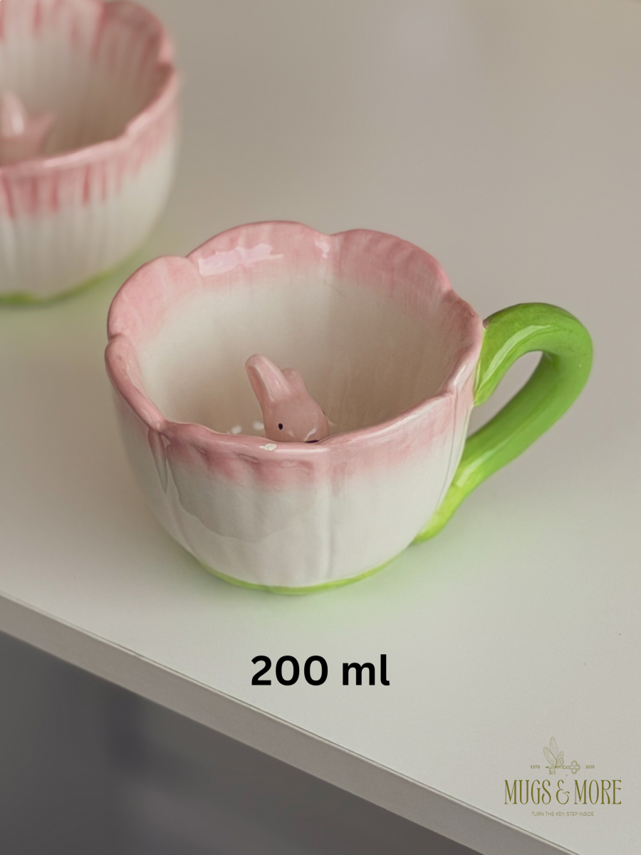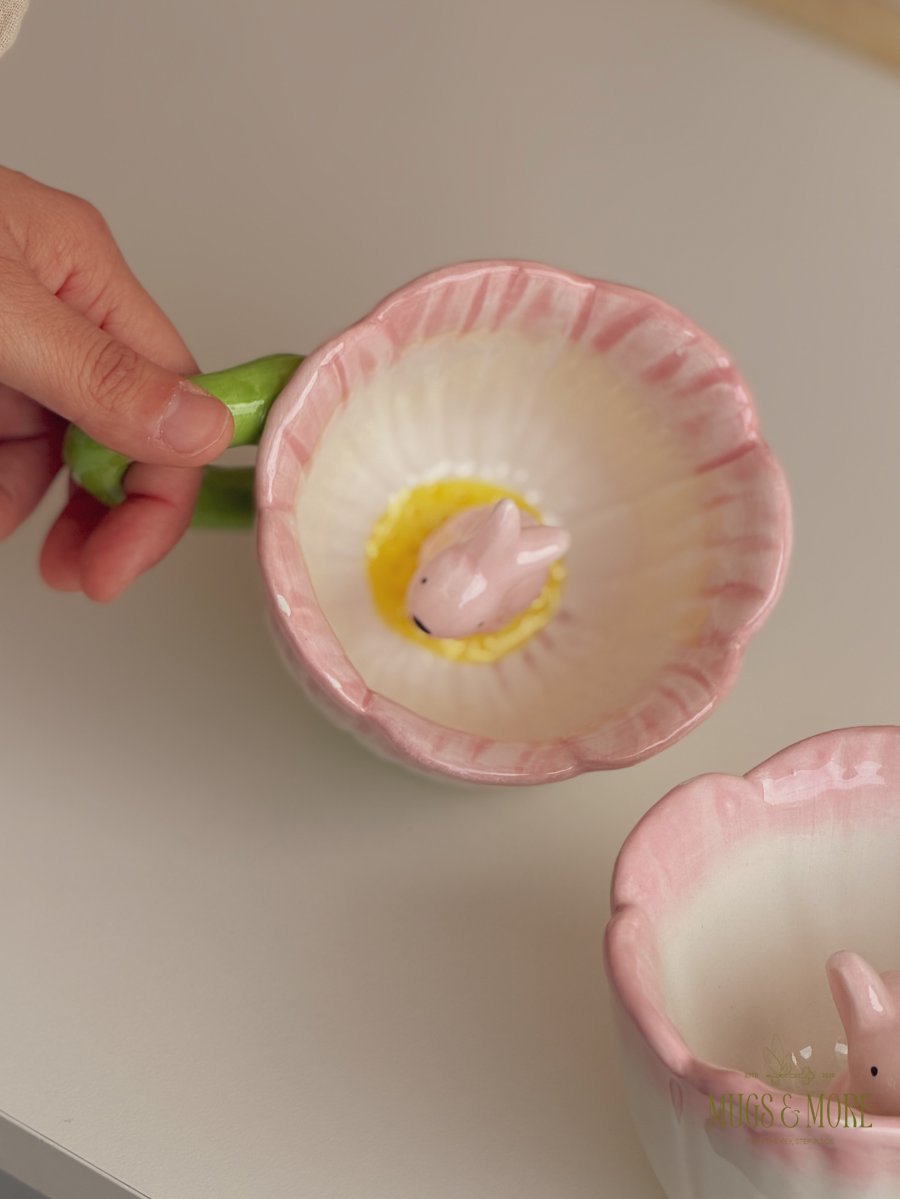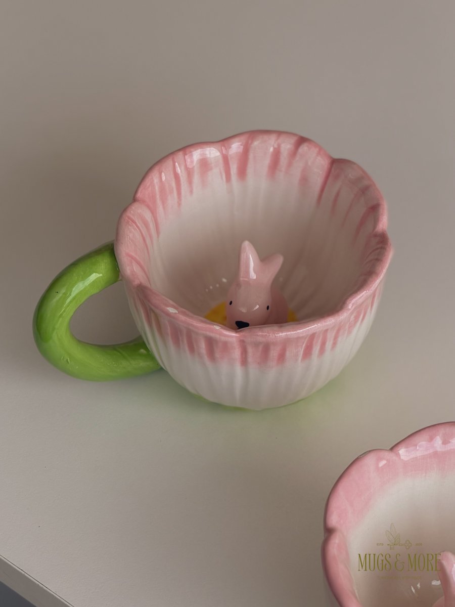 كوب شكل وردة بداخله مجسم أرنب مصنوع يدويًا من السيراميك المزجج