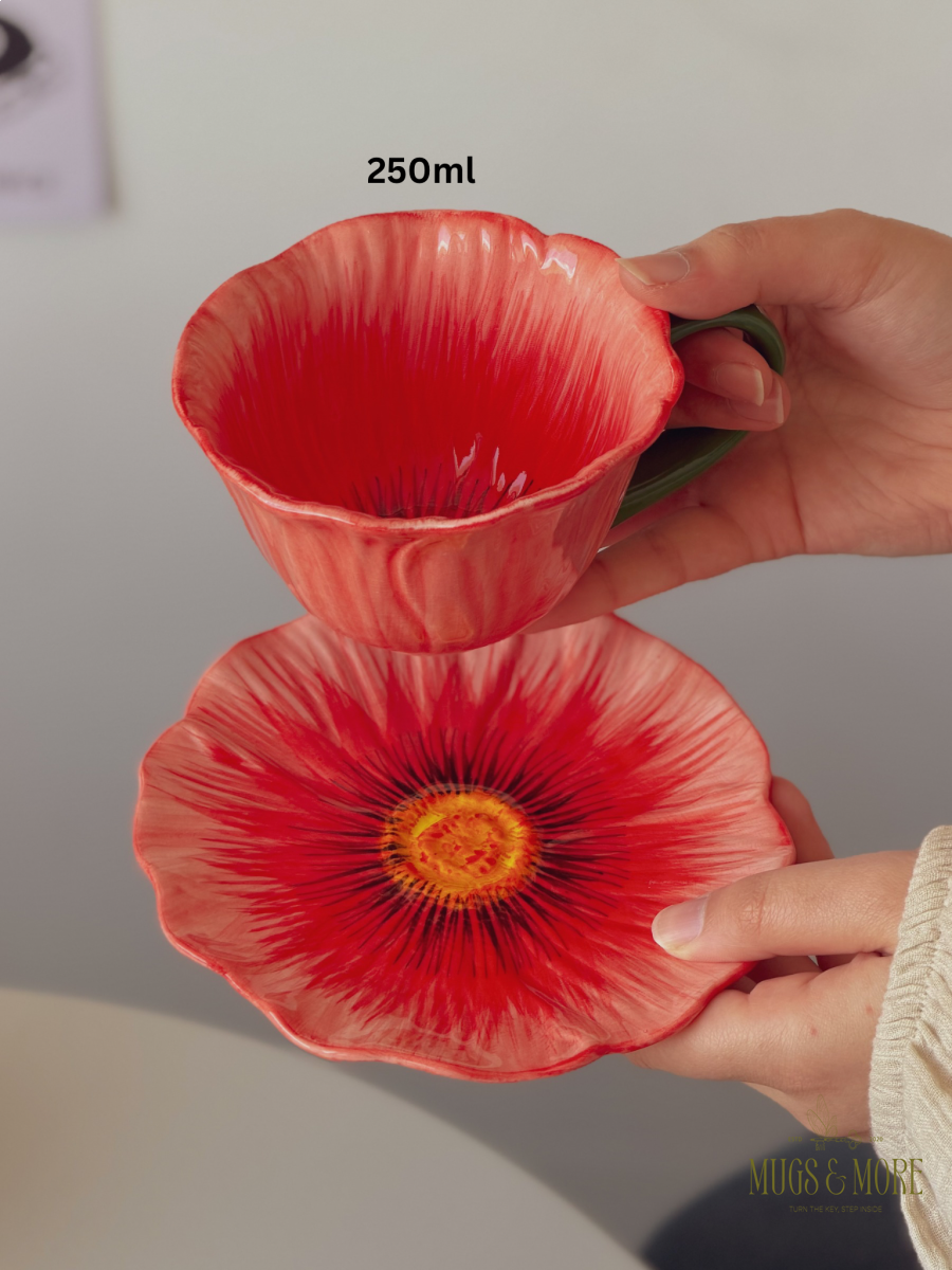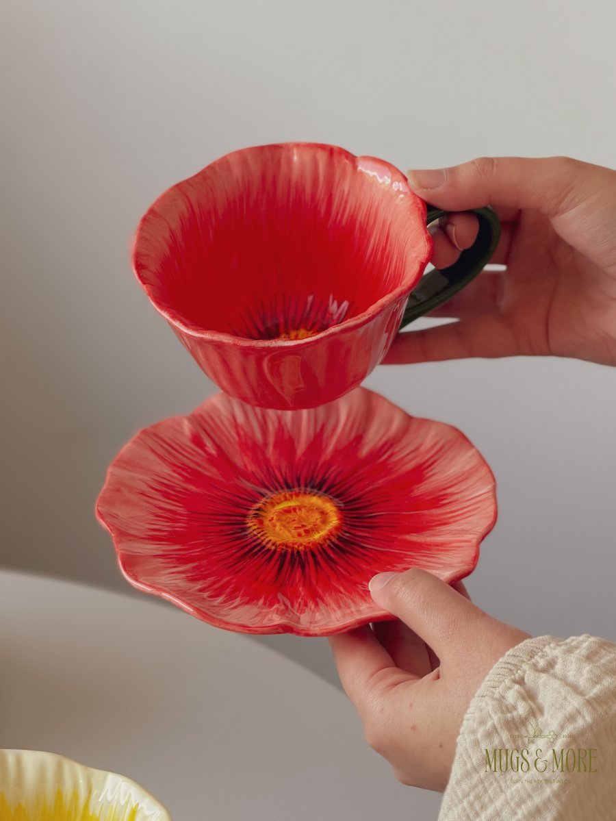 كوب بتصميم وردة مع صحنه لون أحمر ثيم ربيعي