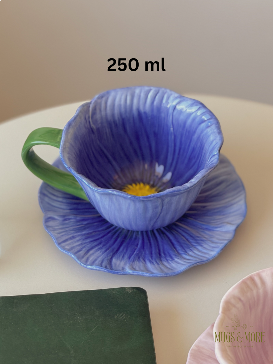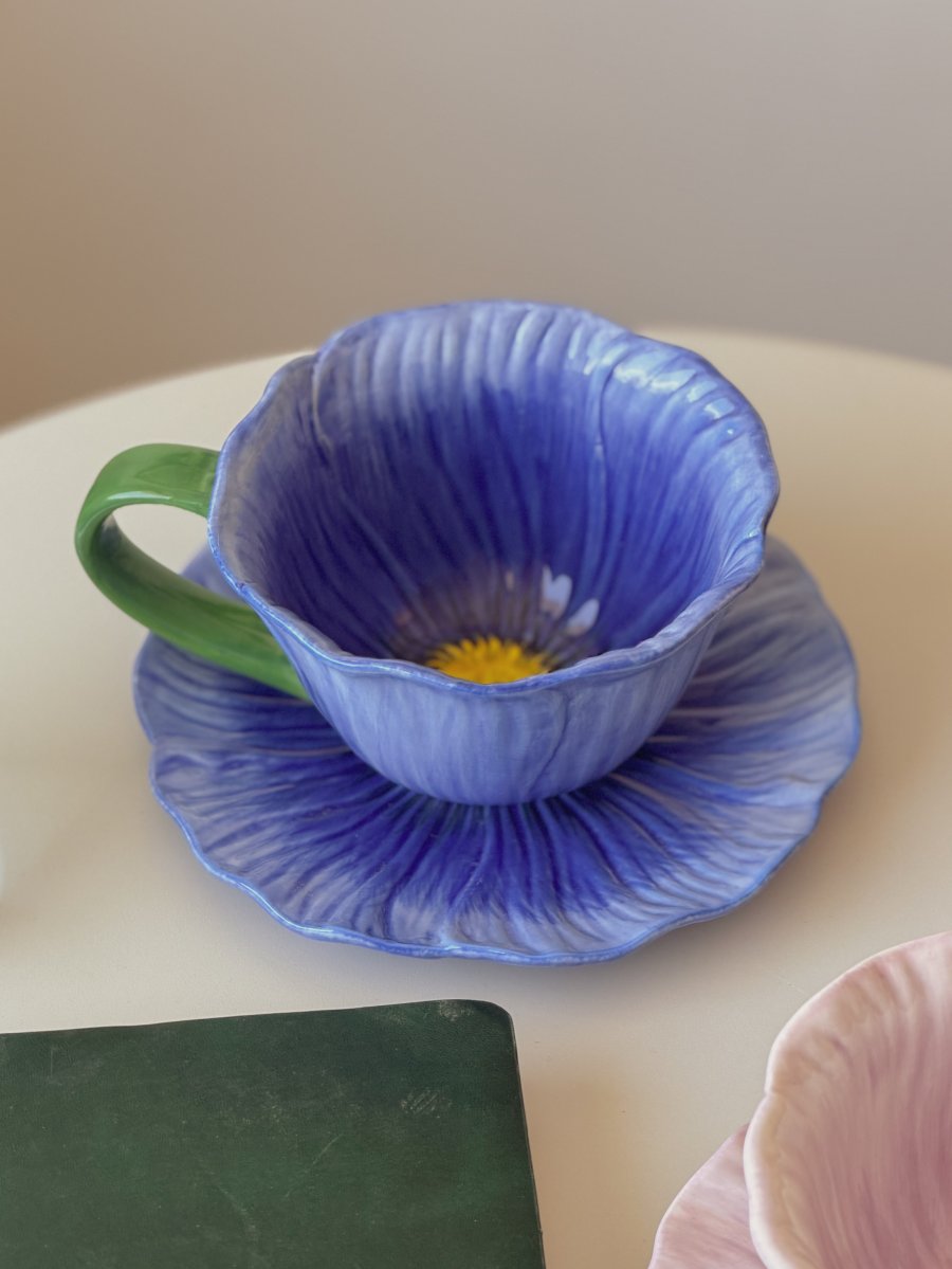 كوب بتصميم وردة مع صحنه لون أزرق غامق ثيم ربيعي