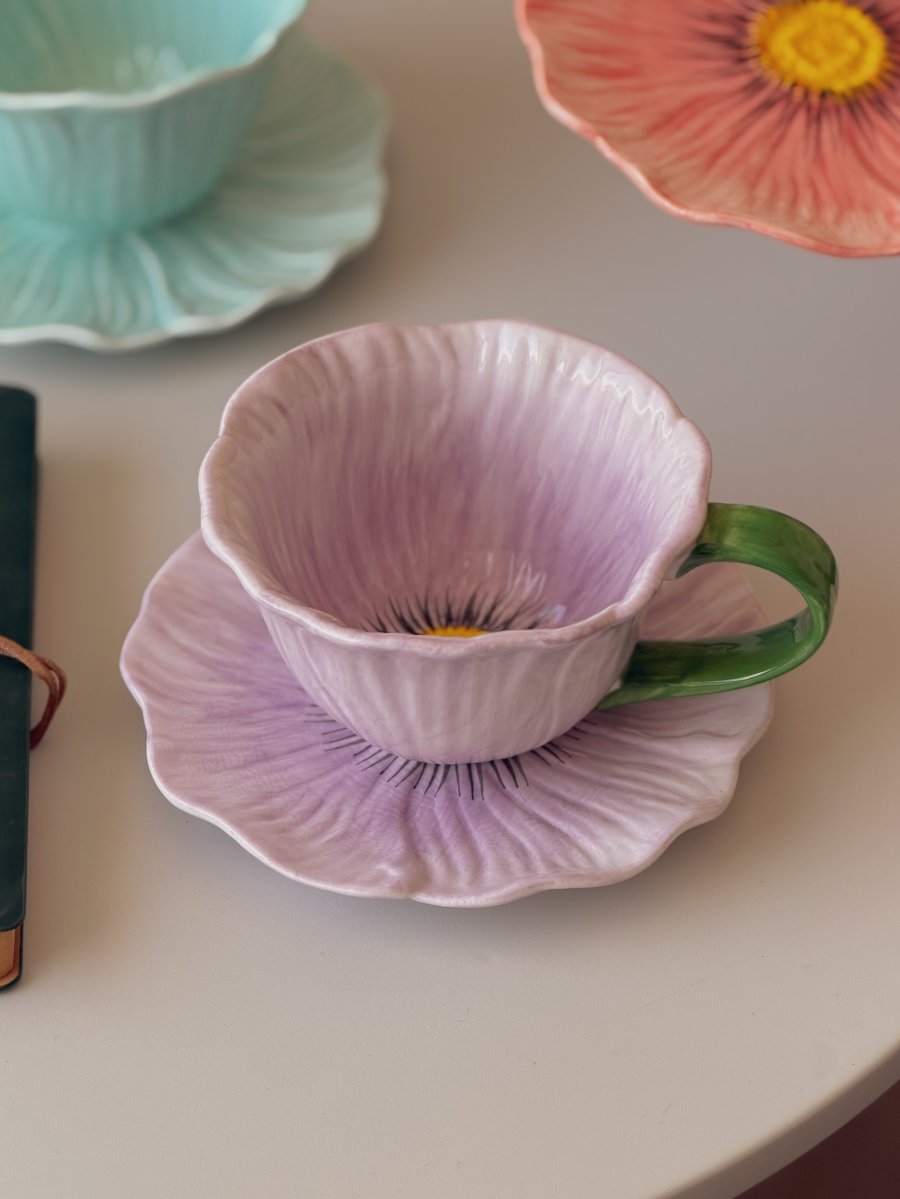 كوب بتصميم وردة مع صحنه لون موف وأخضر ثيم ربيعي