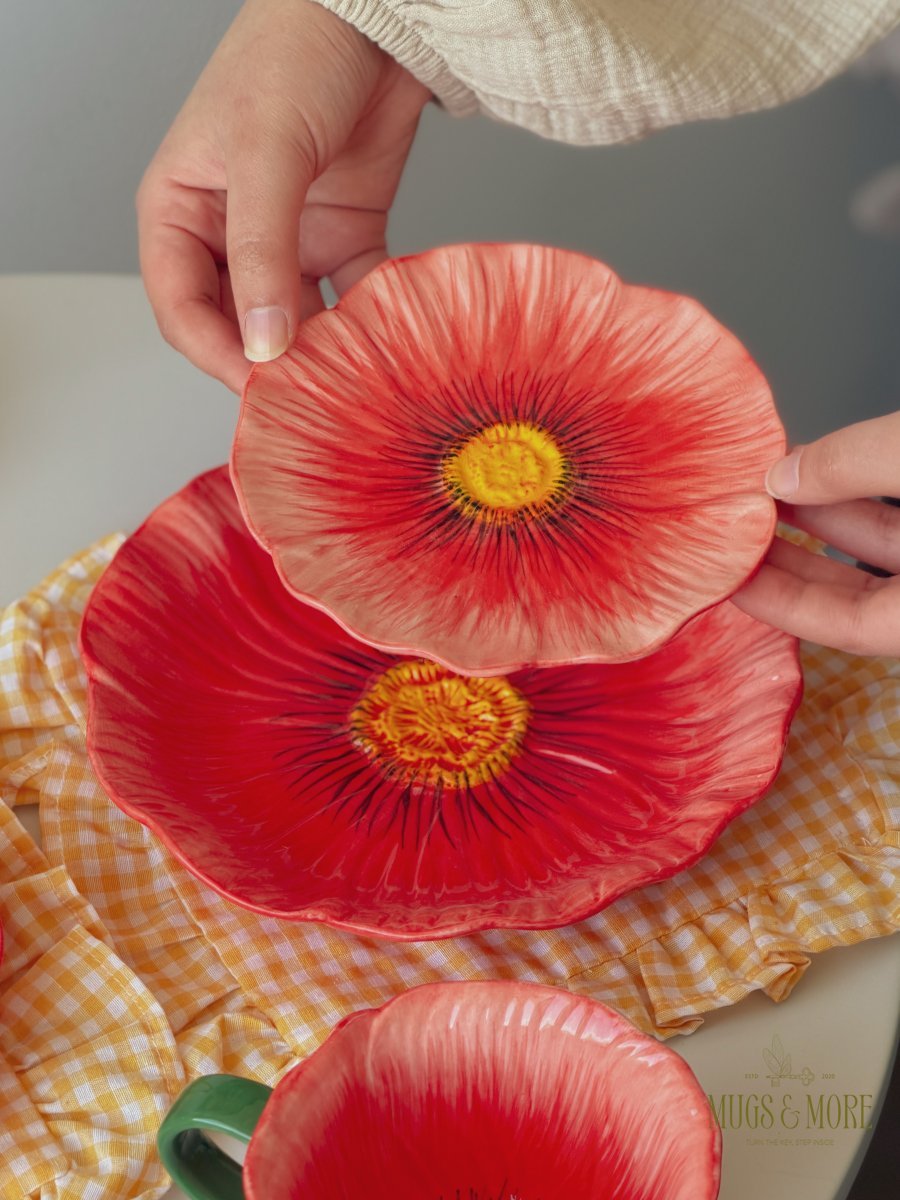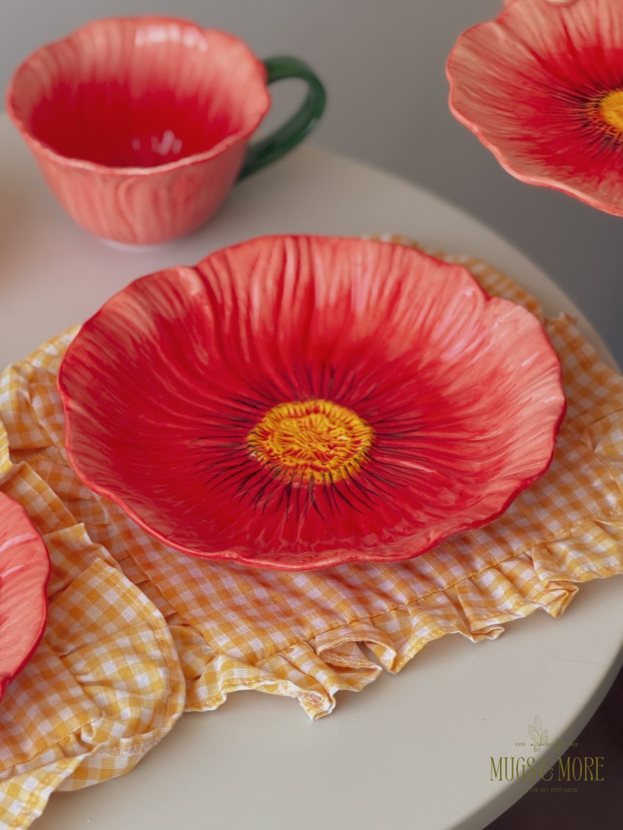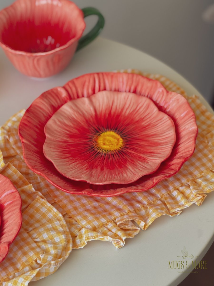 صحن سفرة بورسلان شكل وردة لون أحمر ثيم ربيعي