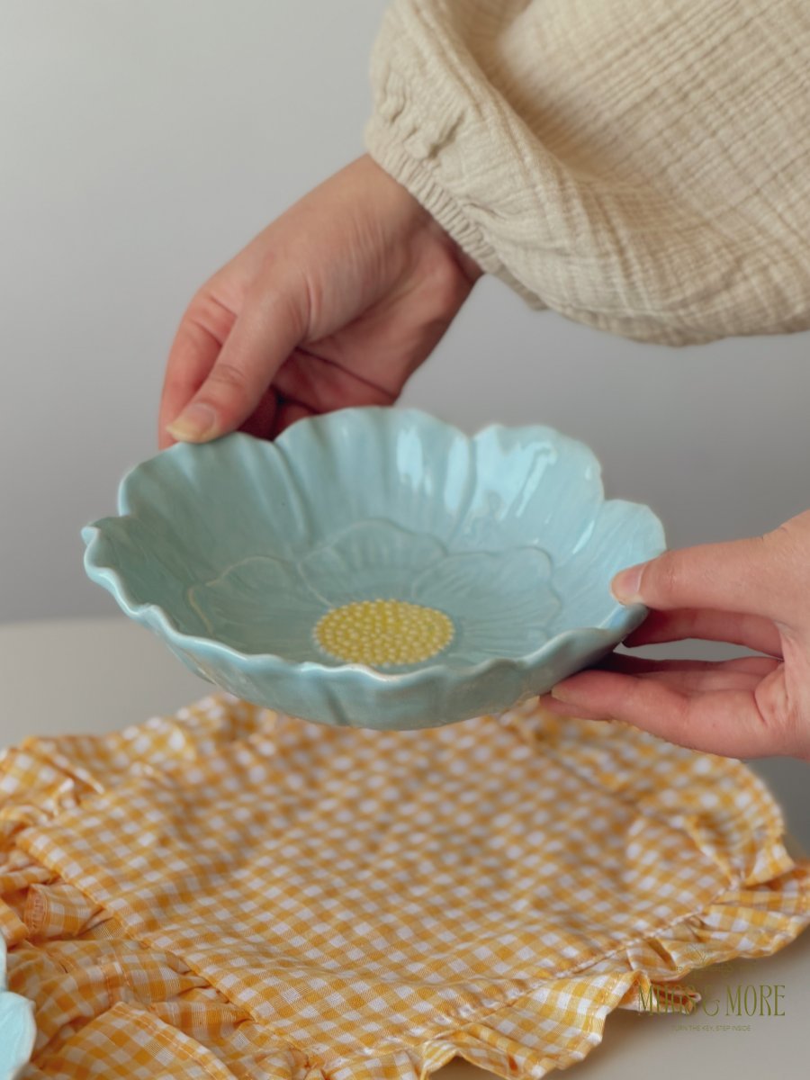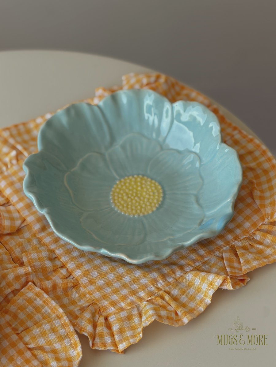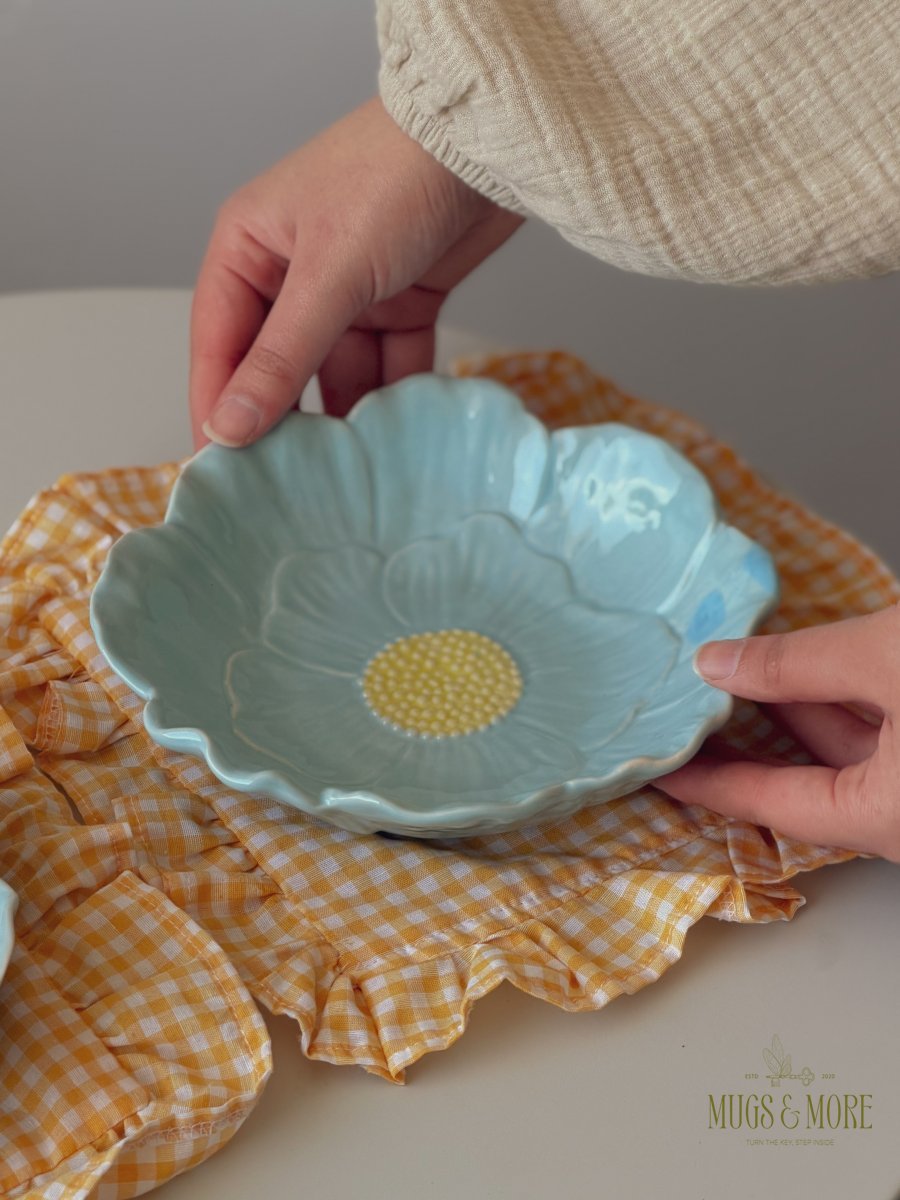 صحن سفرة بورسلان شكل وردة لون أزرق ثيم ربيعي