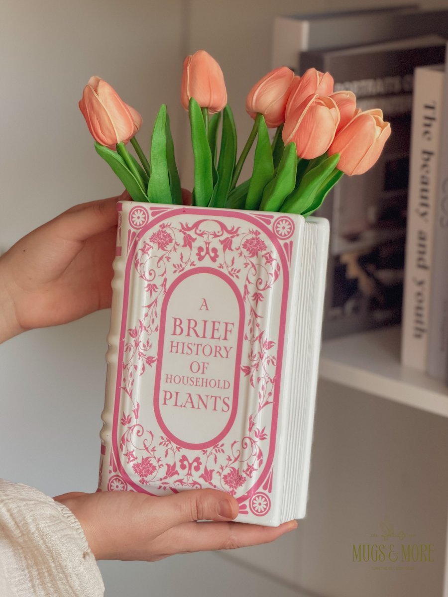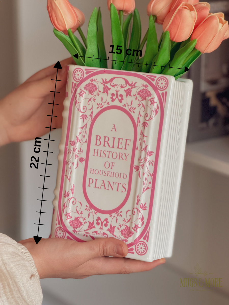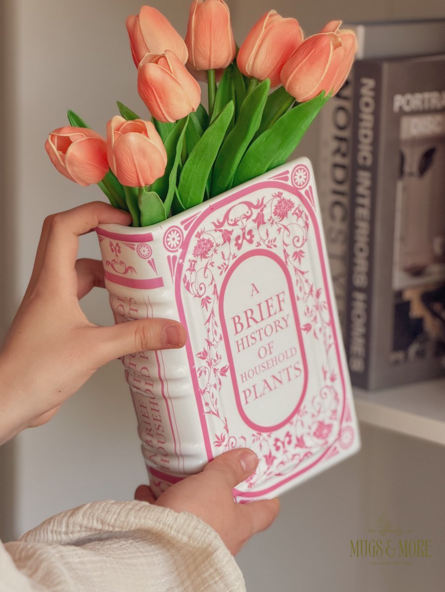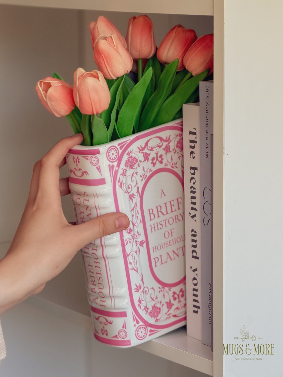 فازة ورد شكل كتاب انجليزي قديم برسومات ورود وزخارف باللون الزهري